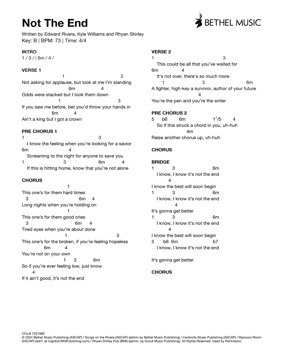 © 2024 Bethel Music Publishing (ASCAP) / Songs on the Rivera (ASCAP) (admin by Bethel Music Publishing) / Centricity Music Publishing (ASCAP) / Raccoon Room (ASCAP) (adm. at CapitolCMGPublishing.com) / Rhyan Shirley Pub (BMI) (admin. by Dvout Music Publishing). All Rights Reserved. Used by Permission.
